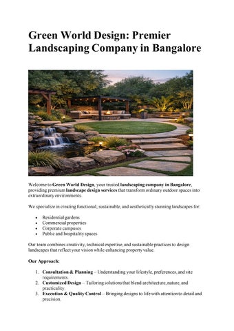 GW Design – Green World Design is a premier landscape design & build firm based in India, offering holistic outdoor and interior design solutions for residential, commercial, and corporate spaces. From innovative landscape architecture and softscaping/hardscaping to sustainable execution and ongoing maintenance, they create personalized environments that blend creativity with functionality. With end‑to‑end design, planning, and project support, GW Design turns vision into inspiring, harmonious spaces that reflect your lifestyle and brand identity.