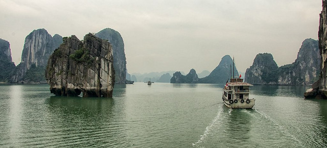 The picturesque and biodiverse limestone karsts and caves of Vietnam's Ha Long Bay have made it a World Heritage site.  Photo by Bob DeGraff, taken on 21 February 2015. Licensed under Creative Commons Attribution-NonCommercial-NoDerivs 2.0 Generic.
