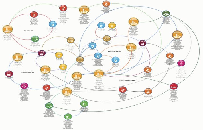 SDGs 1 (No Poverty) and 13 (Climate Action) include similar targets as SDG 11 and use some of the same indicators.11 There are many other connections with other SDGs – about a third of the SDGs have an urban component.12 The visualisation below shows a few of the interlinkages for this goal.